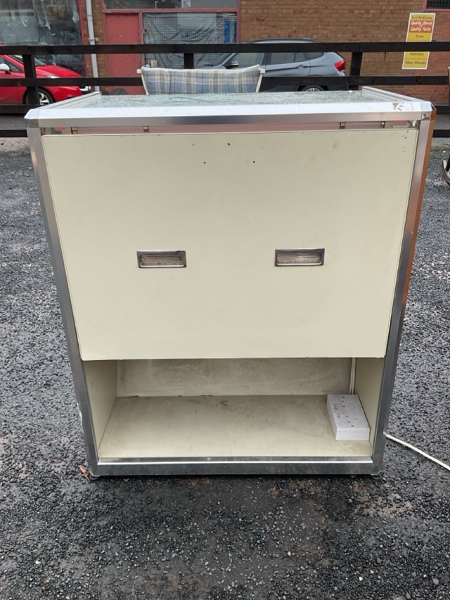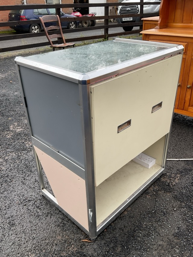A glazed counter top display cabinet with chamfered frame enclosing an illuminated drawer compartment, with open shelf below. (29.5in x 20.5in x 35in)