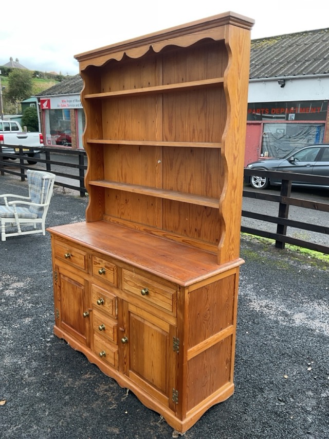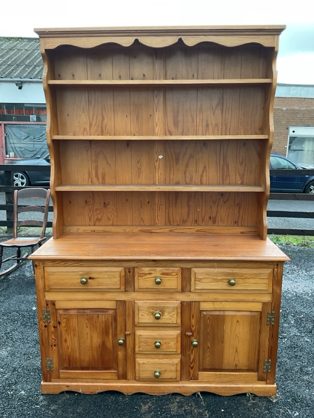 A Victorian style pine dresser with shaped apron above three plate shelves to delft rack, the base with six brass knobbed drawers and two fielded panelled cupboards. (54in x 18in x 81in)