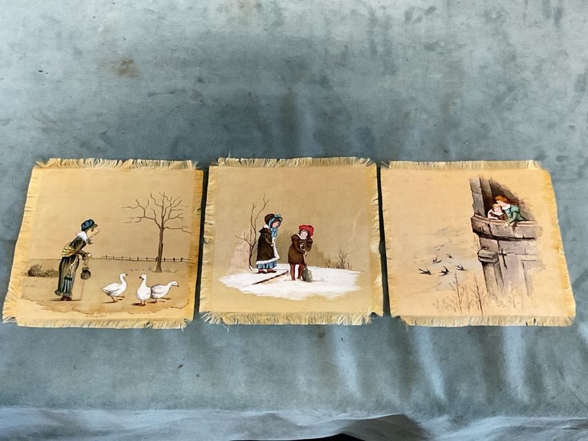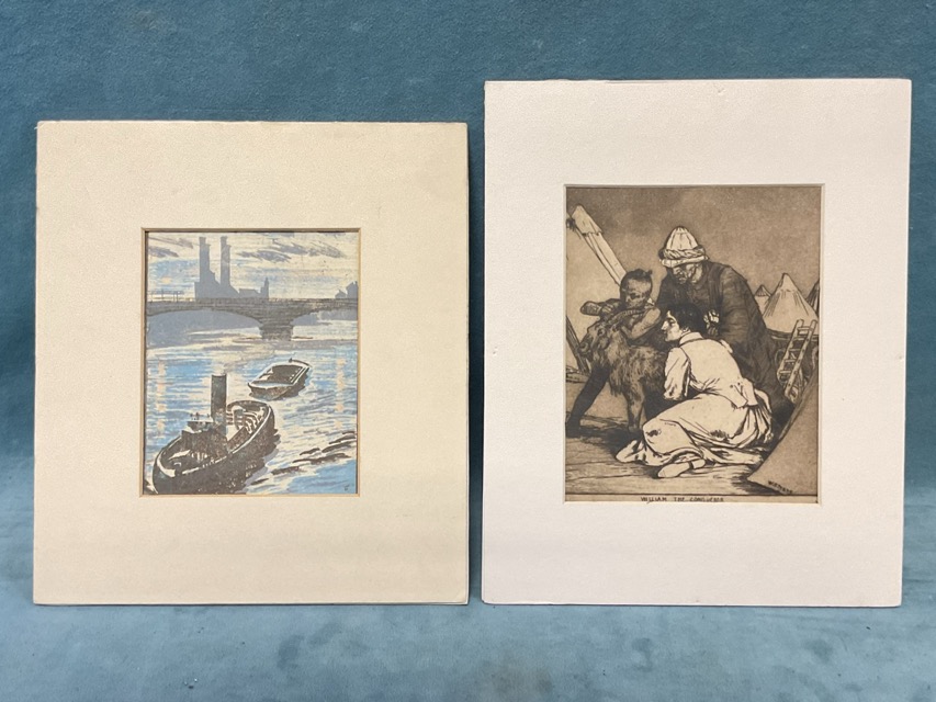 Percy Telford, three-colour woodcut, Thames Barges near Battersea, titled on label to verso, mounted; William Strang, etching and aquatint, an illustration from Kipling titled William the Conqueror, signed in the print, mounted; and three Victorian handpainted silks with Kate Greenaway style scenes. (5)