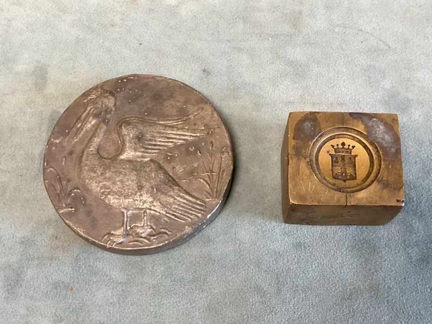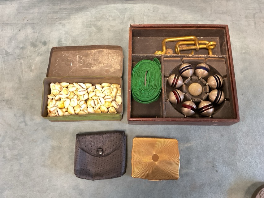 An oval deco chrome mirror tray; a tin of cowrie shells; an unusual mahogany boxed table game; an Edwardian straw boater; a 50s Stratton gilt musical compact; a Victorian circular lead paperweight cast with a pelican; and a bronze seal matrix with a marquess coat of arms. (7)