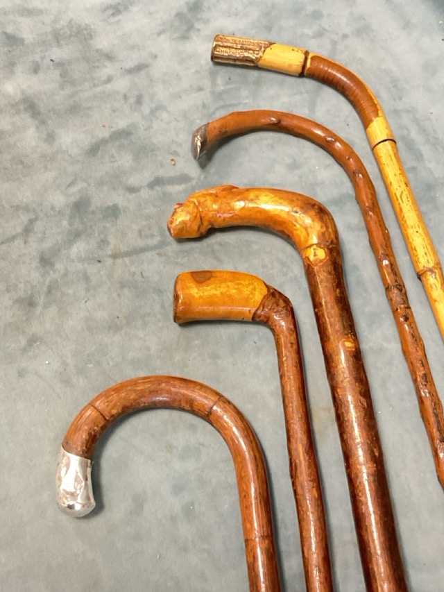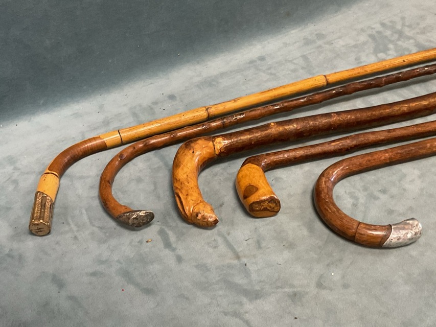 Five antique walking canes - bamboo with gilt-metal finial, a Birmingham 1919 hallmarked silver mounted crook handled, knotty wood with obscured silver hallmarks, hazel with carved hares head, and angled root handle. (5)