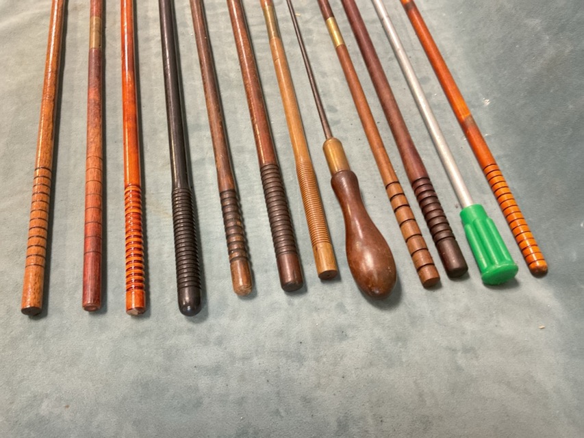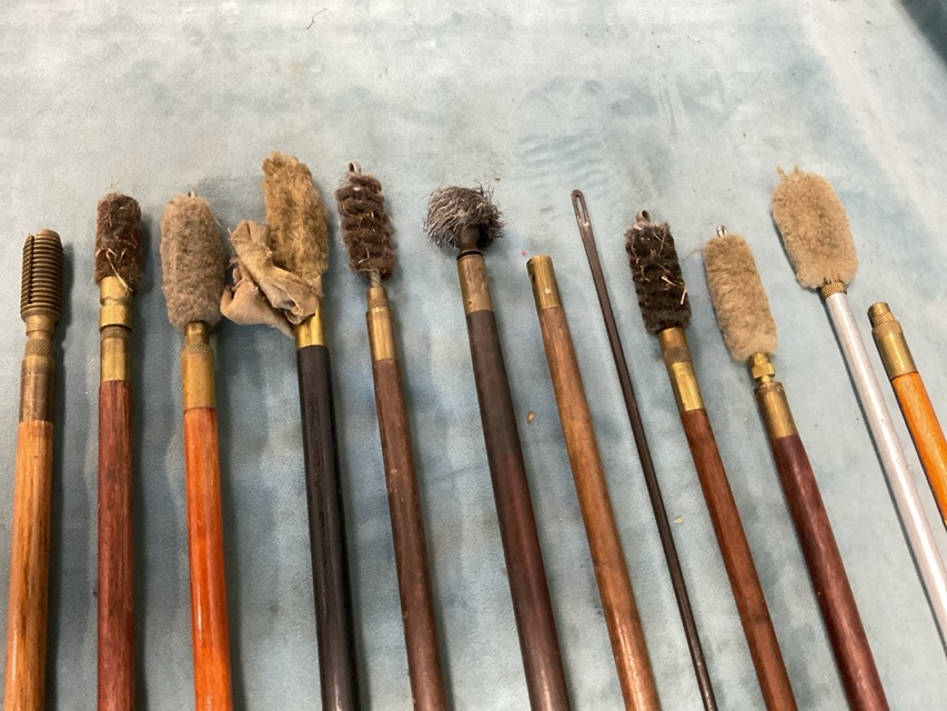 Twelve miscellaneous gun cleaning rods with brass mounted mahogany, ebonised and cane shafts, having wire brush, fleece, and other heads. (12)