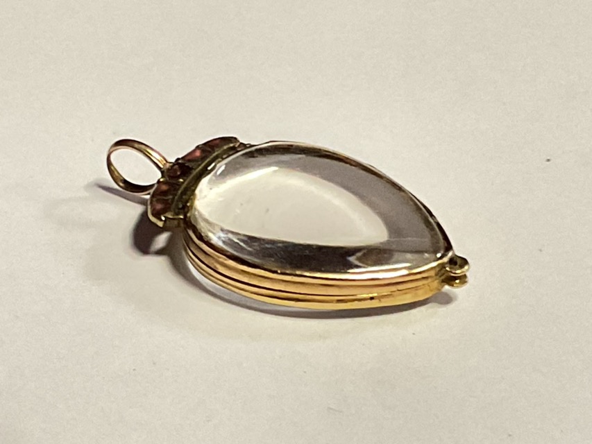 A Georgian heart shaped double-sided rock crystal gold locket with an arched crest of five small foiled garnets, unmarked. (1.25in)