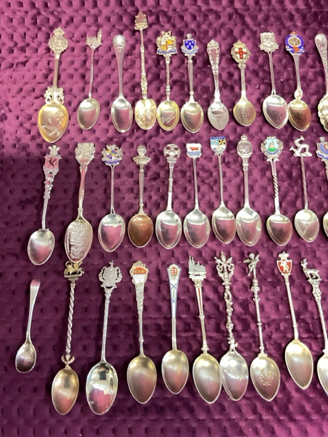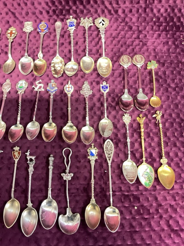 A collection of 43 hallmarked and sterling silver enamelled commemorative & souvenir teaspoons - 566.7g; and six silver plated and gilt metal spoons. (49)