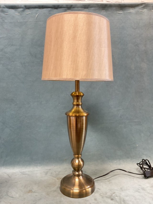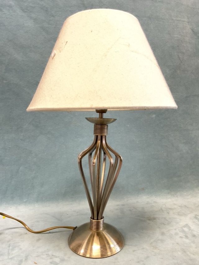 A patinated brass tablelamp with open cage baluster column on a domed circular base, with fabric shade; and another taller with vase shaped column on a flared circular base, with fabric shade. (2)