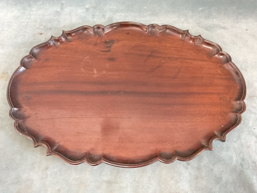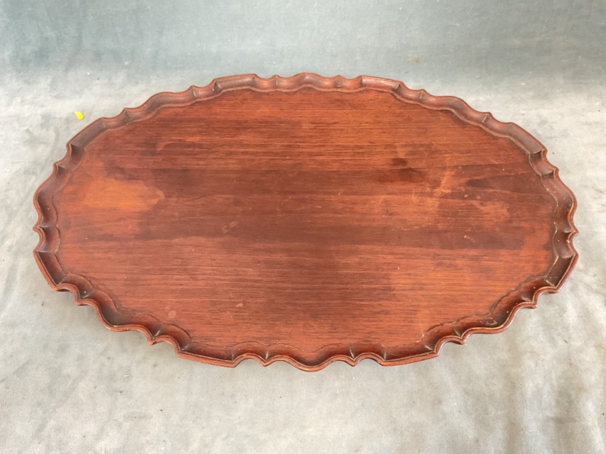 Two similar C19th Georgian style carved mahogany oval trays with raised piecrust borders. (24in and 19.25in) (2)