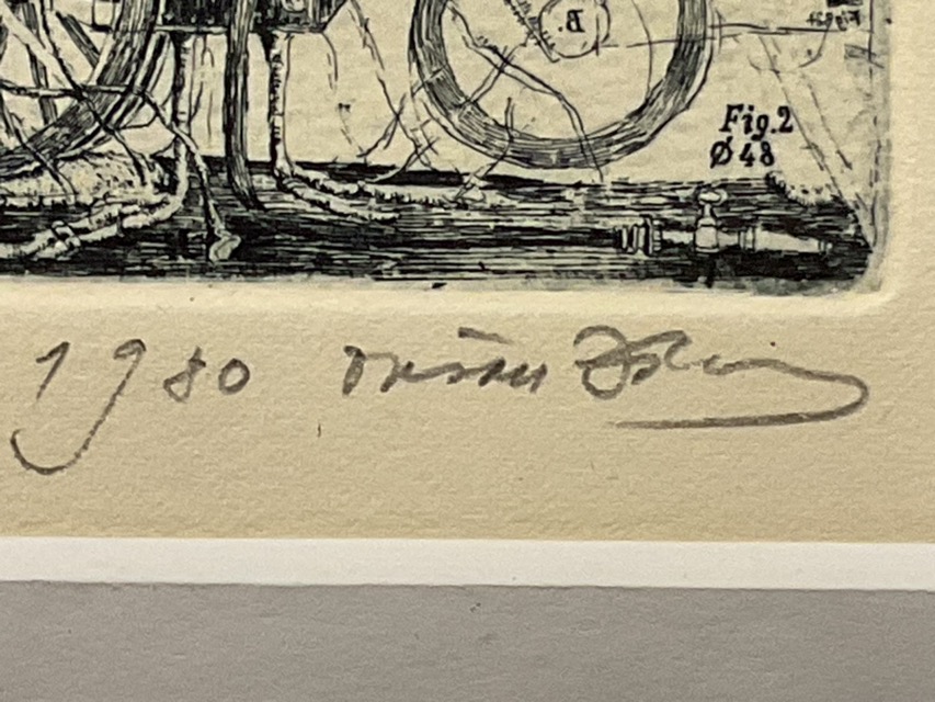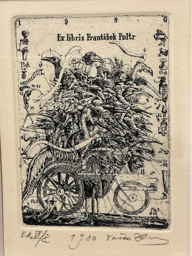 Dusan Kallay, etching, surrealist bookplate for František Pultr with a fantastical vehicle piled with birds, signed, dated, numbered, mounted and gilt framed. (2.5in x 3.5in)