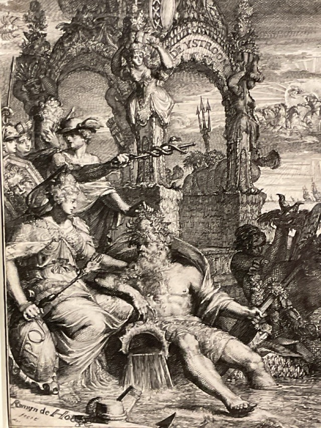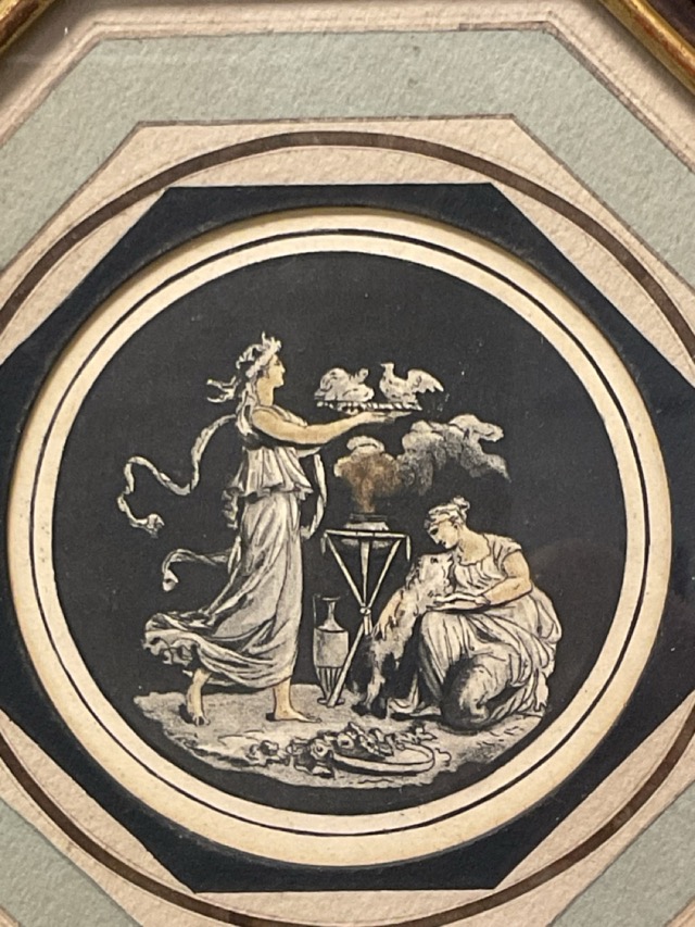 Romeyn de Hooch, engraving, the personification of the River Ij surrounded by classical gods, signed in the print and dated 1671, mounted and oak framed - 5in x 6.5in; and an early C19th circular print of classical maidens sacrificing at a brazier, mounted and framed - 2.75in x 2.75in. (2)