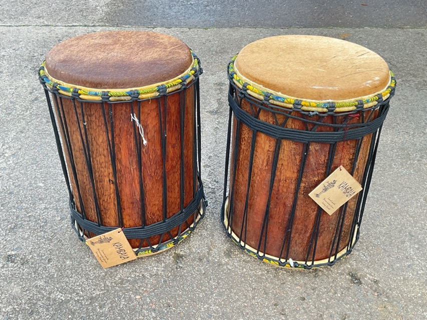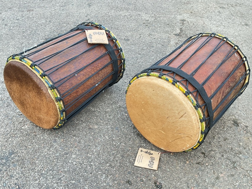 A pair of professional Ivory Coast Kambala DoumDoum double-sided drums with hollowed log bodies, cow hide skins and fleece lined travel cases. (14in x 22in) (2)