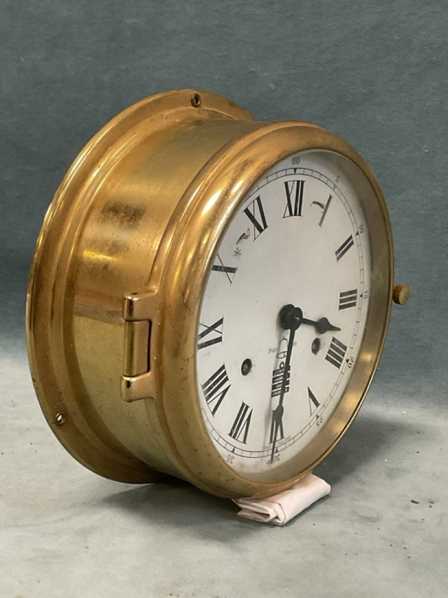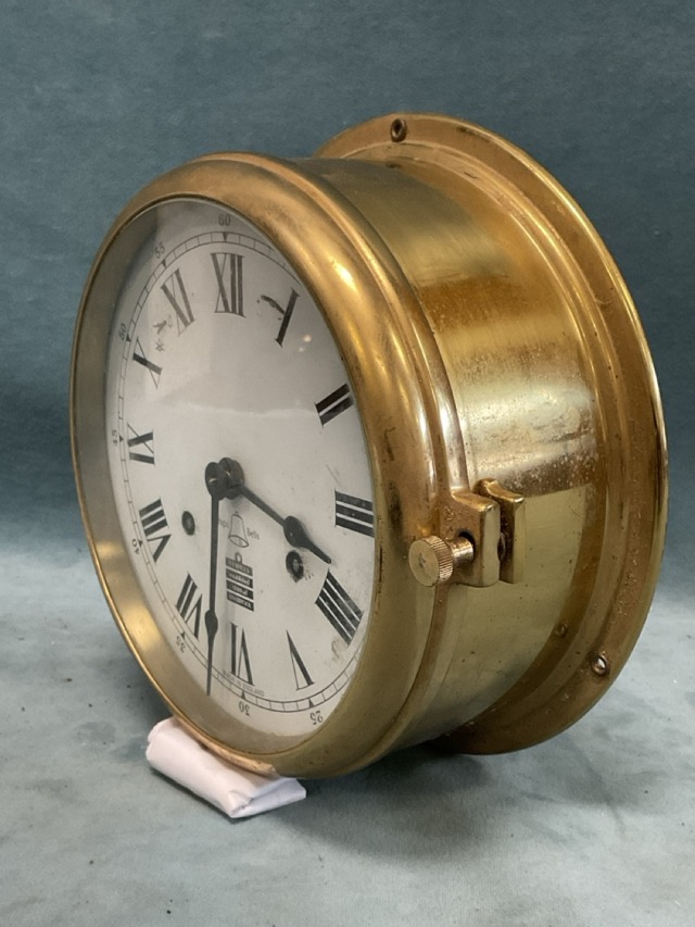 A circular brass 8-bells striking ships bulkhead clock by Sewills of Liverpool, with enamelled dial, roman chapters, strike/silent and fast/slow levers, etc. (7.25in x 7.25in x 3in)