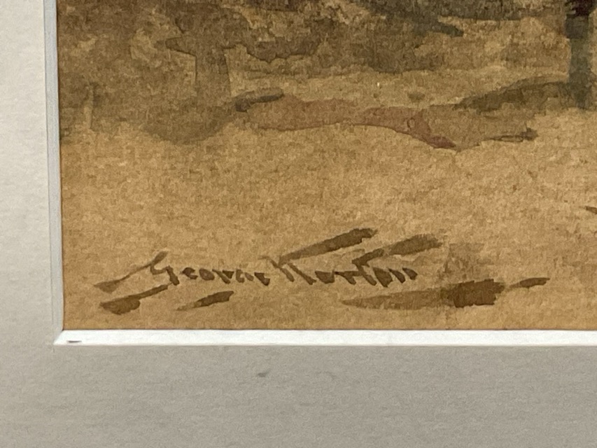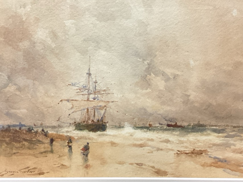 George Horton, watercolour, a collier brig aground on the Black Middens, North Shields with figures on the shore and the distant Tyne piers, signed, mounted and oak framed. (9.75in x 6.75in)