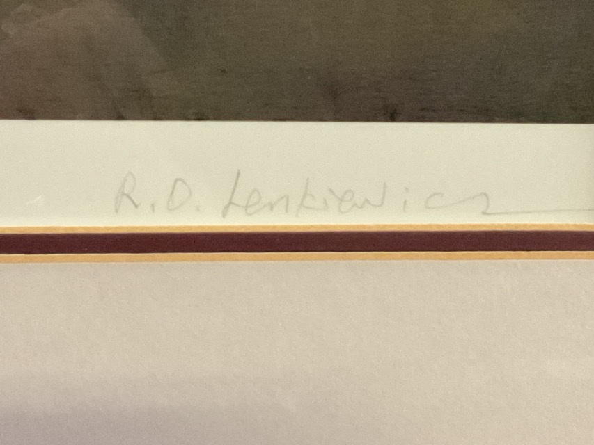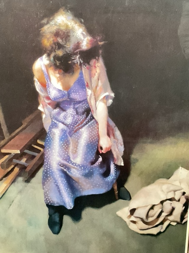 Robert Lenkiewicz, limited edition coloured print, seated woman in a purple dress in the artists studio, titled Painter With Women - St Antony Theme, signed, bearing Washington Green blindstamp, numbered, mounted, and gilt framed. (18.75in x 24.5in)