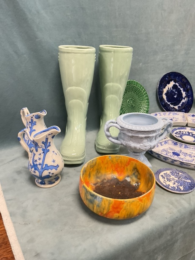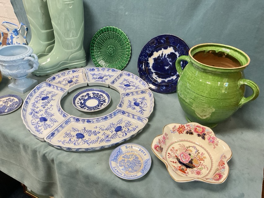 Miscellaneous ceramics - a Villeroy & Boch sectional onion pattern hors d’oeuvres dish, a Victorian Warwick vase, a pair of green wellie vases, a pair of Victorian jugs, a majolica plate, a Spanish glazed terracotta pot, etc. (A lot)