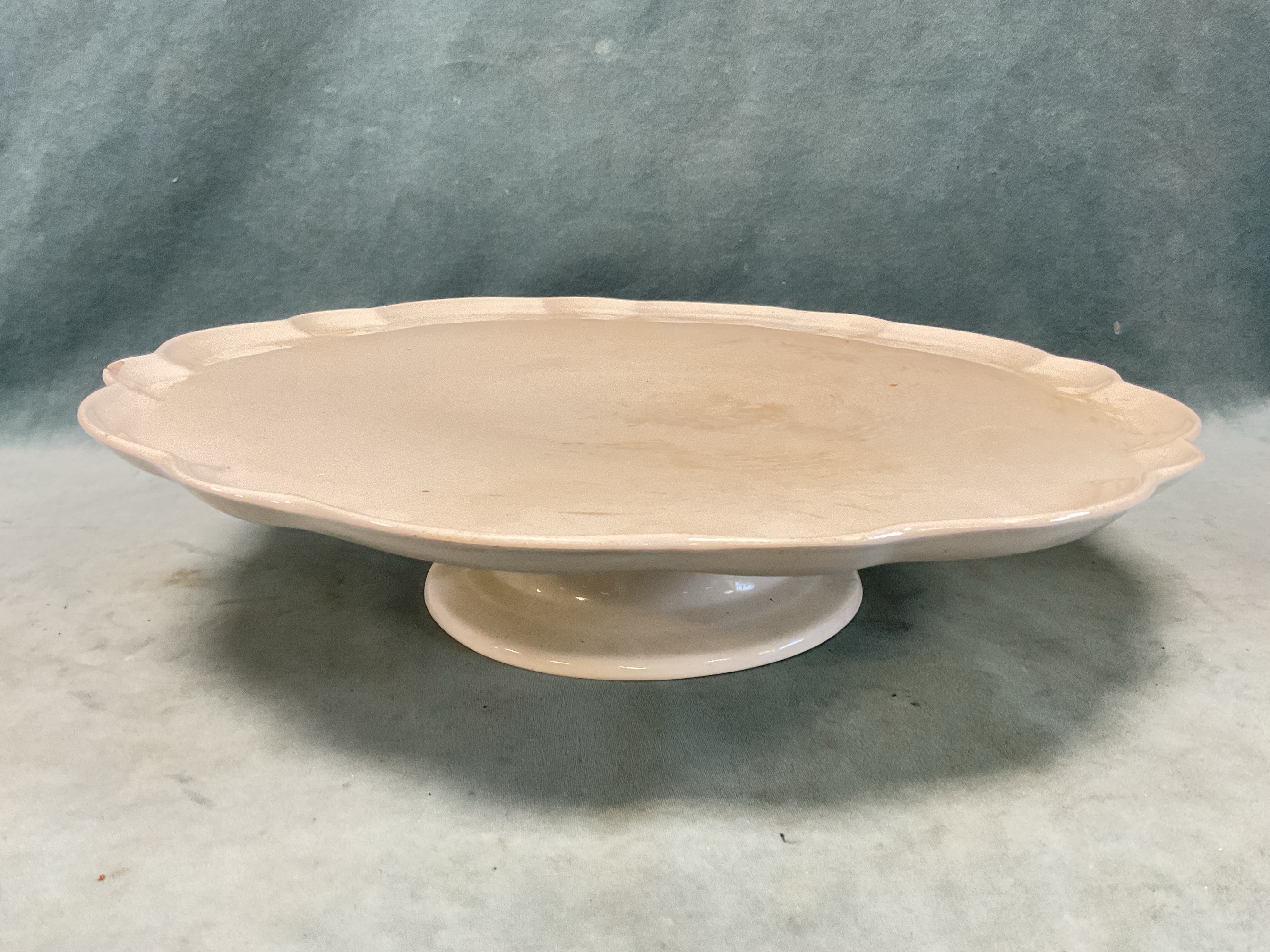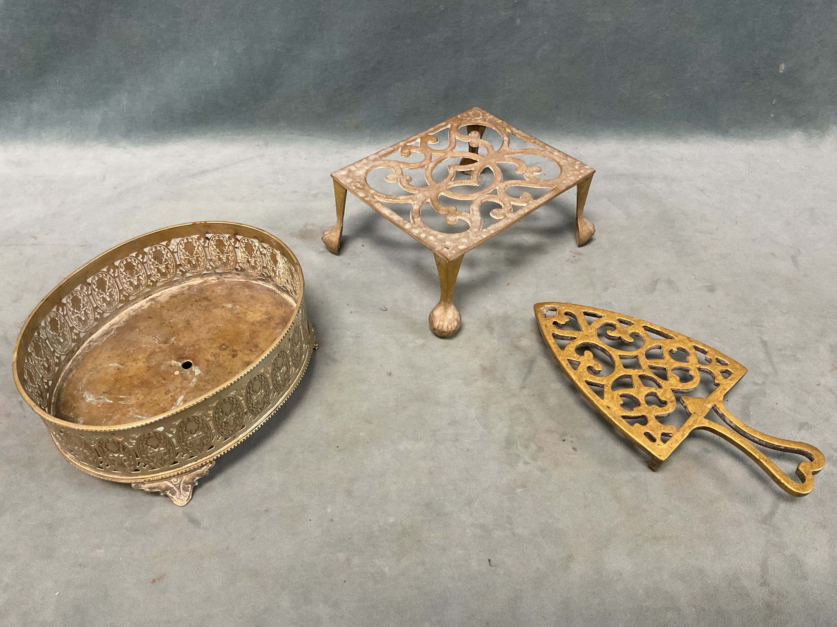 A Victorian ceramic lazy susan with scalloped circular top rotating on a domed base; two Victorian pierced brass trivets; and an oval silver plated cruet stand with pierced sides. (4)