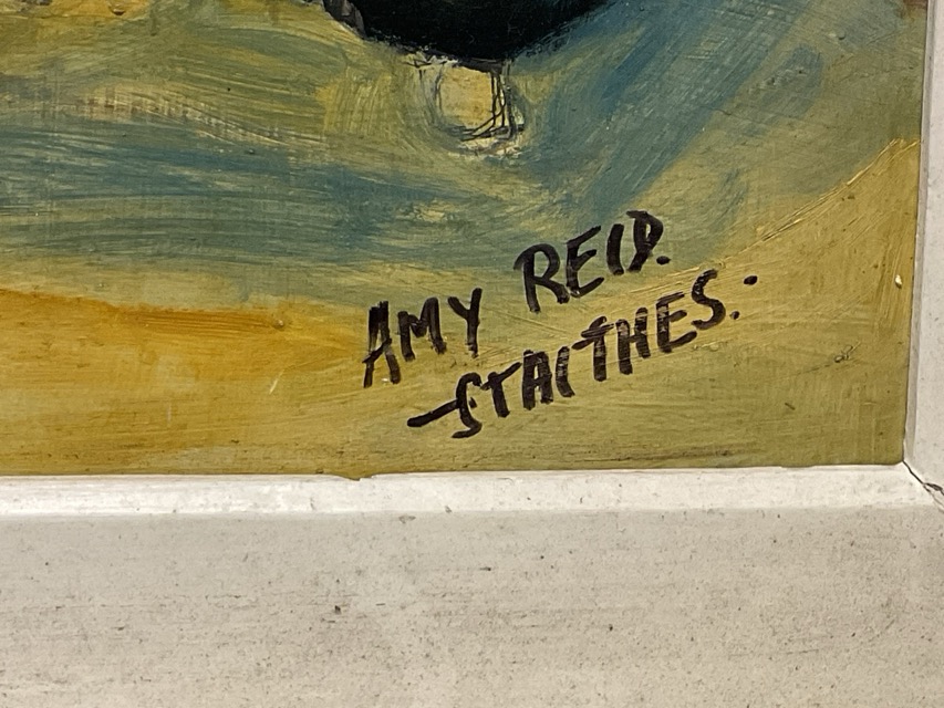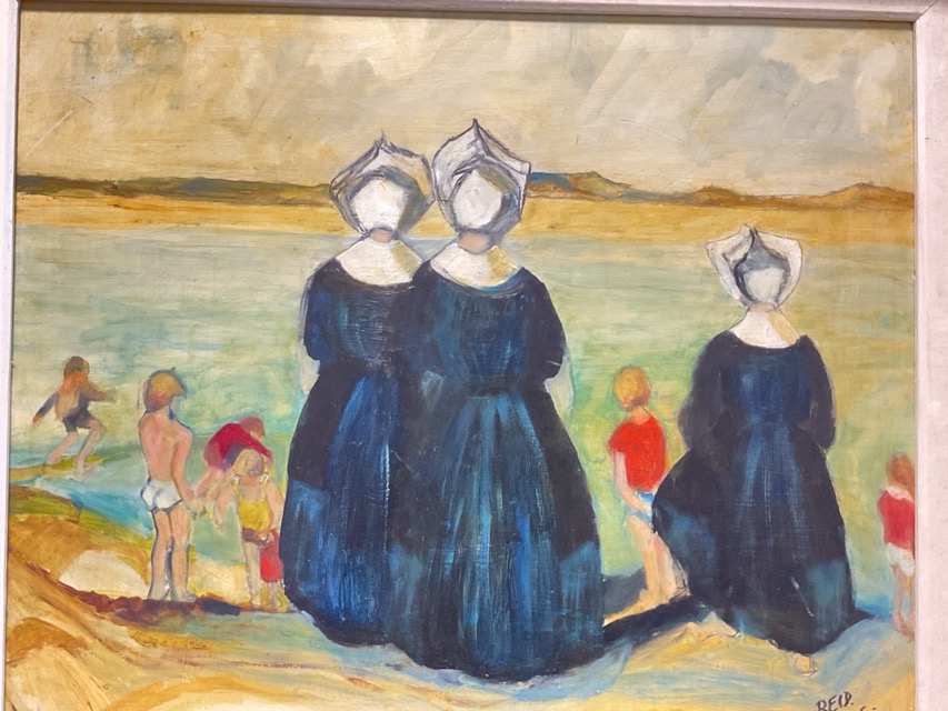 Amy Reid, oil on board, children and nuns at the beach, signed and framed. (23.25in x 19.25in)