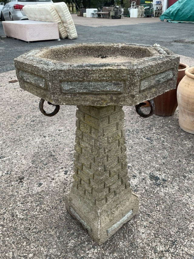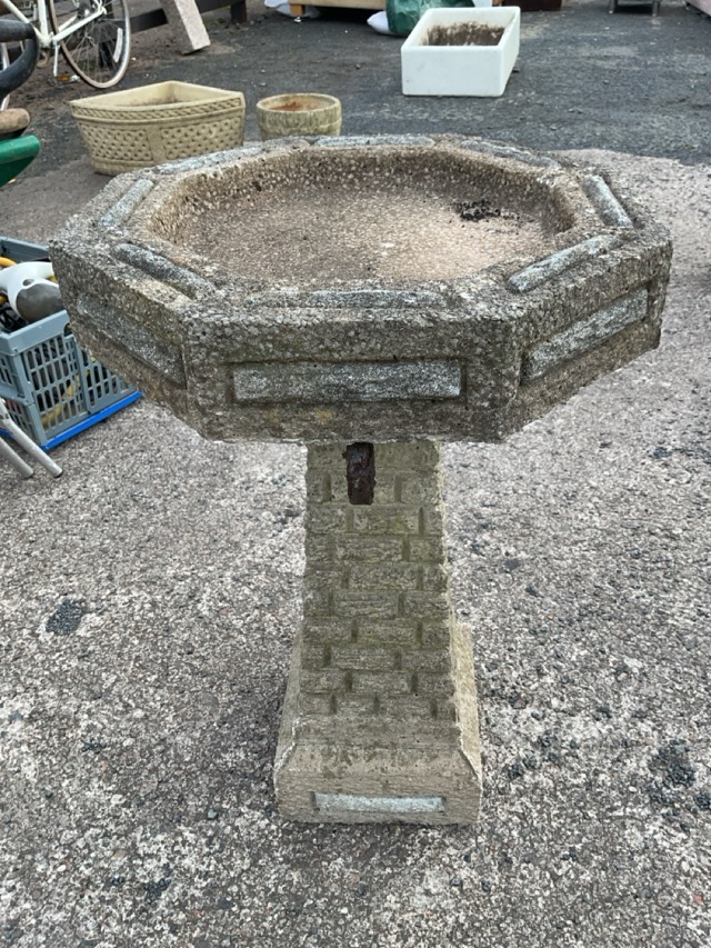 A composition stone garden birdbath with octagonal bowl having scrolled iron mounts on a tapering faux brick column. (17.5in x 25.5in)