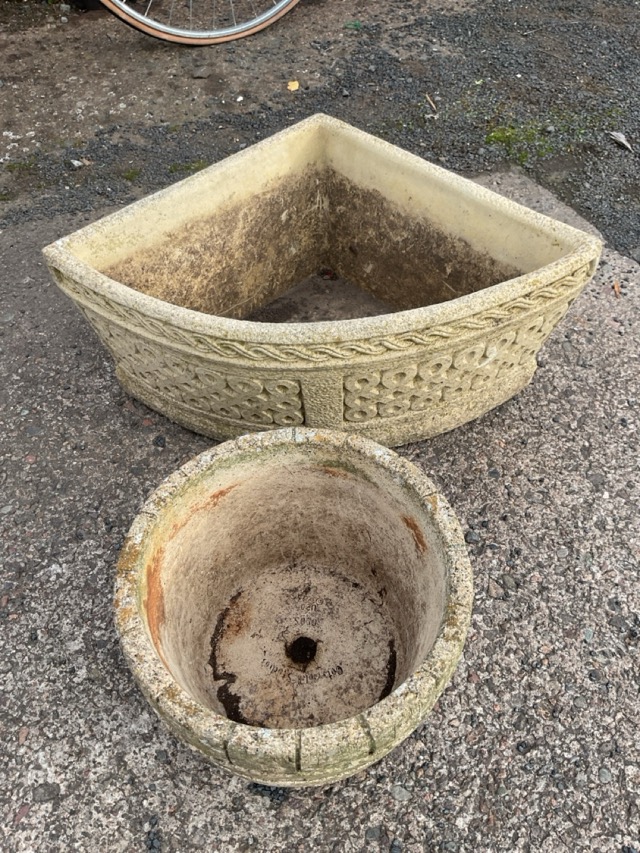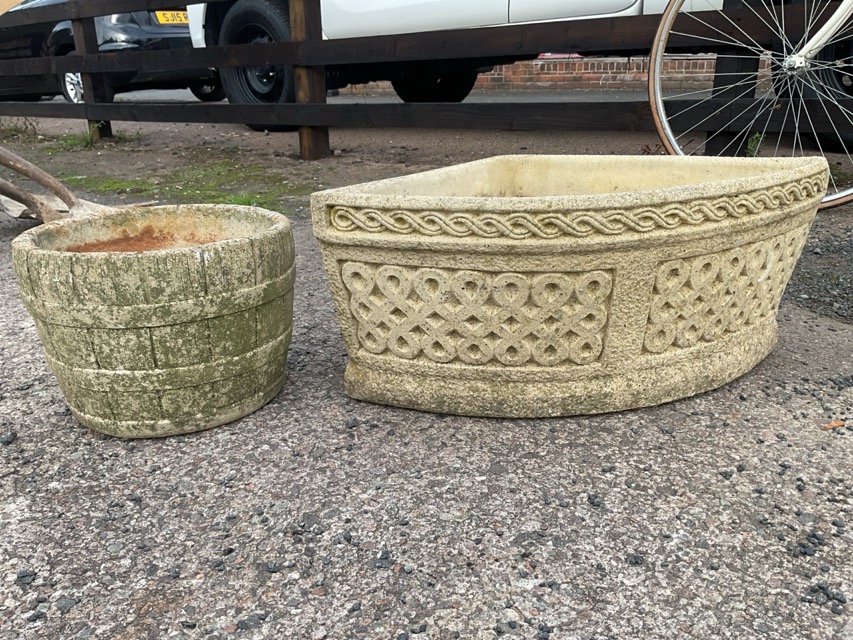 A composition stone garden corner planter embossed with scrolled panels beneath ropetwist frieze; and a circular faux stone bucket shaped pot of barrel form. (2)