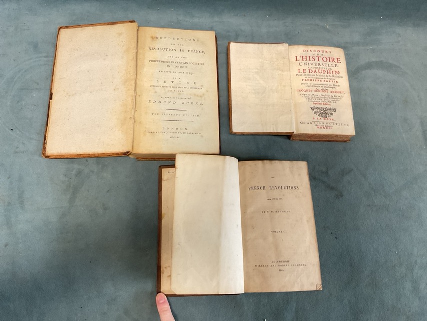 The French Revolutions from 1789 to 1848 by TW Redhead, vols 1 & 2 together leather bound - Edinburgh 1848; Discours sur l’Histoire Universel by Jacques Bossuet, vol 1 - Amsterdam 1702; and Reflections on the Revolution in France by Edmund Burke, 11th edition - London 1791. (3)