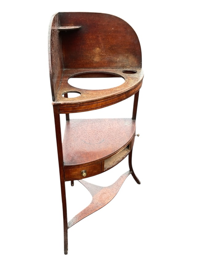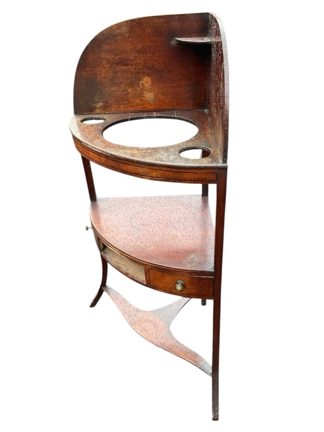 A Georgian mahogany bowfronted corner washstand with shaped back above shelf pierced for bowls, the mid-tier platform having absent central drawer, raised on square splayed legs united by stretcher. (22.5in x 15.25in x 43in)