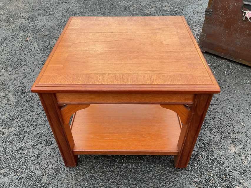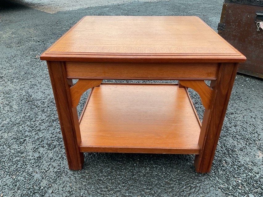 A contemporary teak coffee table with crossbanded moulded top on square rounded column legs joined by undertier tray platform, the legs with shaped spandrels. (19.75in x 19.75in x 16.5in)