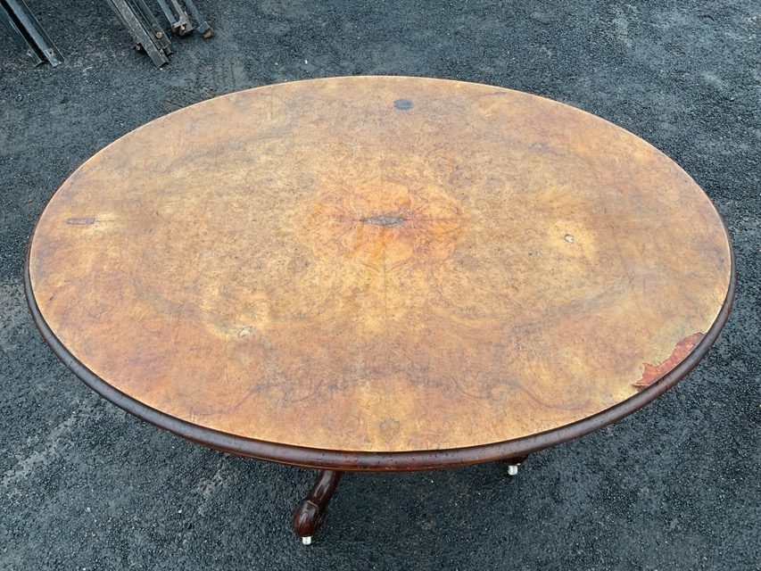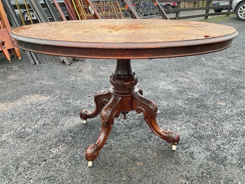 An oval Victorian walnut loo table, the moulded top with plain frieze supported on a carved turned column with quadripartite hipped scroll carved legs on pot castors. (47in x 32in x 28.75in)
