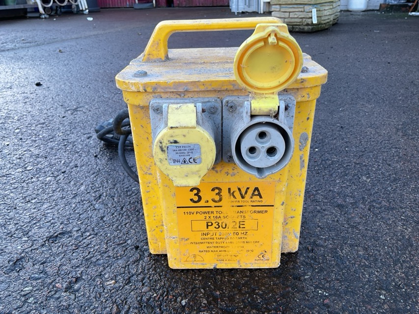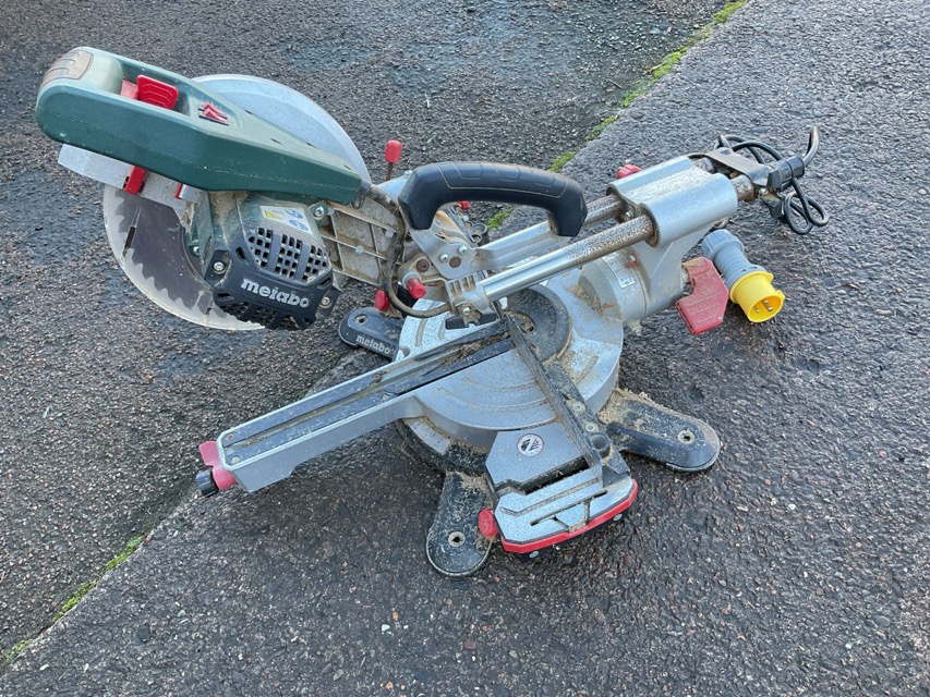 A Metabo circular saw on mitre block turntable stand, complete with power source transformer. (2)
