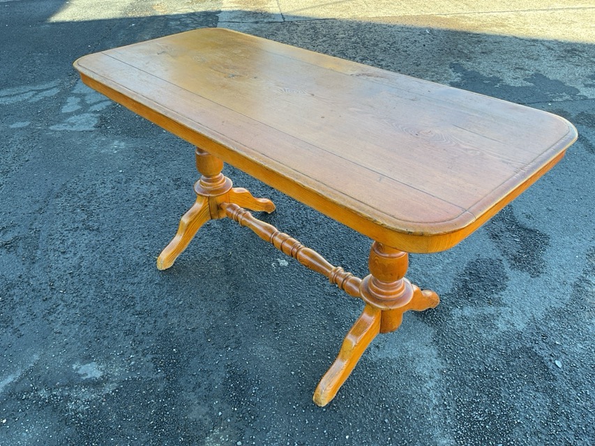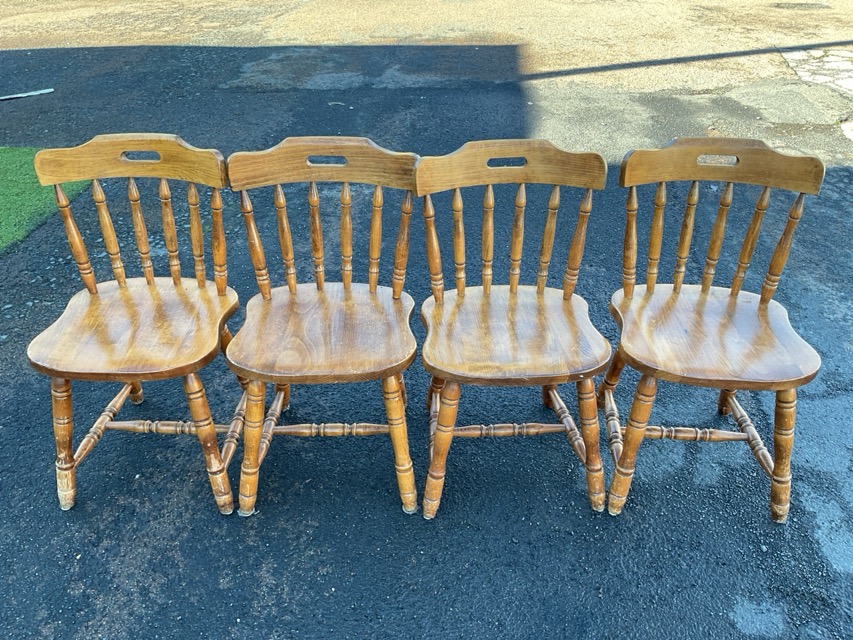 A rectangular Victorian oak table with moulded rectangular rounded top on twin turned columns and splayed legs, joined by conforming turned stretcher, together with a set of four later spindleback chairs with saddle shaped seats. (23.5in x 52in x 28.5in) (5)