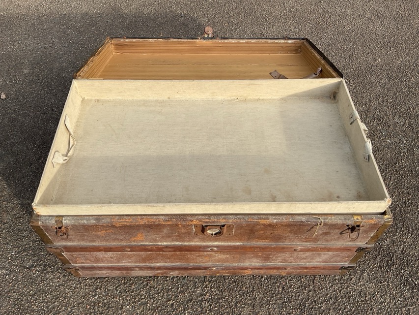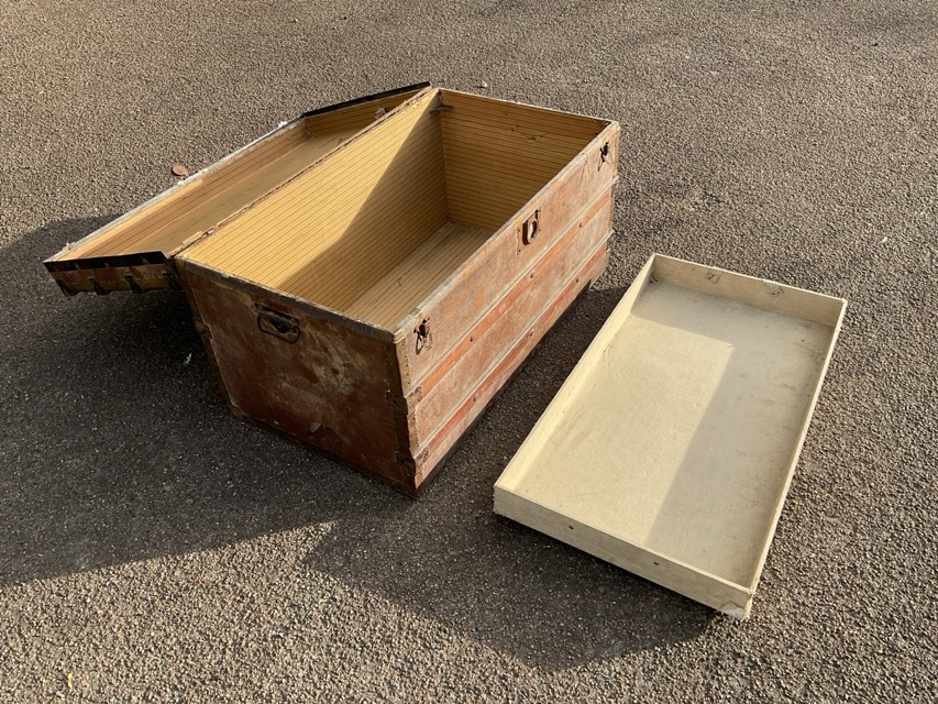 An old trunk having lined interior with tray, the hardwood slats with studding on hessian ground, having carriage handles to ends. (35.5in x 19.75in x 19.75in)