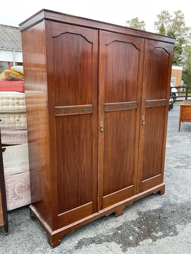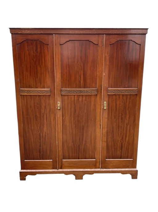 An Edwardian mahogany wardrobe with three doors enclosing a fitted interior with hanging space, shelves and compartments, the panelled doors decorated with blind fretwork band, raised on bracket feet. (59in x 19.75in x 72.5in)