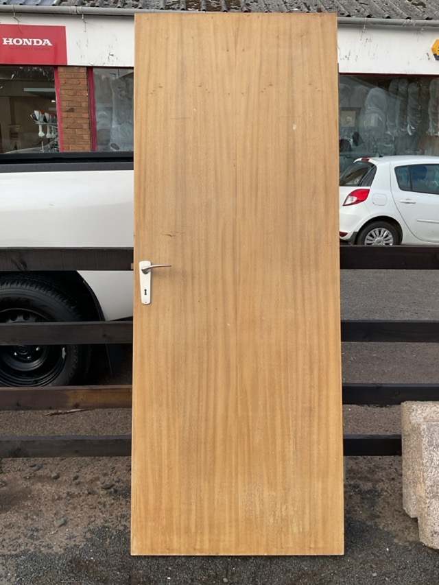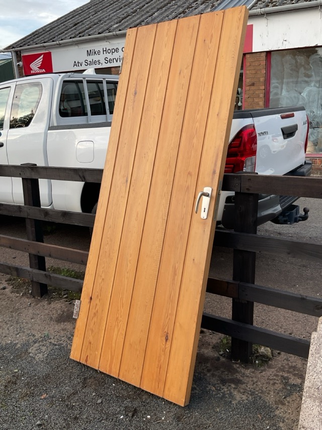 A 70s internal door of pine plank construction with with mortice lock & handle. (30in x 78in)