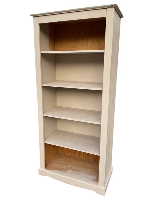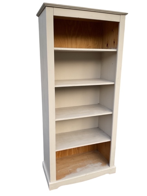 A painted pine set of shelves or bookcase, with moulded cornice above five deep shelves, having shaped apron plinth below. (23.5in x 17in x 72in)