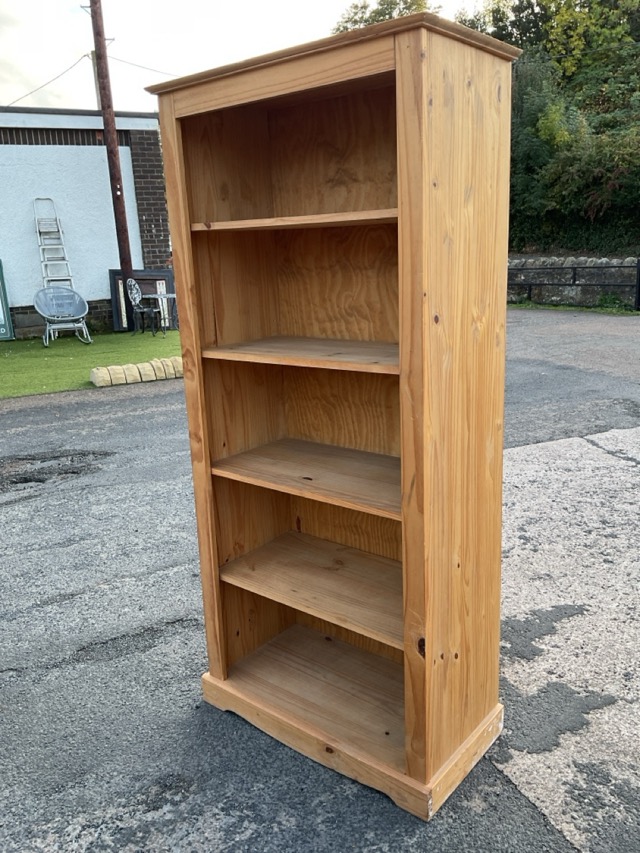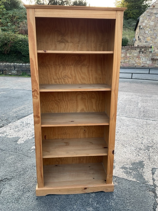A set of pine open shelves or bookcase, with moulded cornice above five deep shelves, having shaped apron plinth below. (33.25in x 17in x 72in)