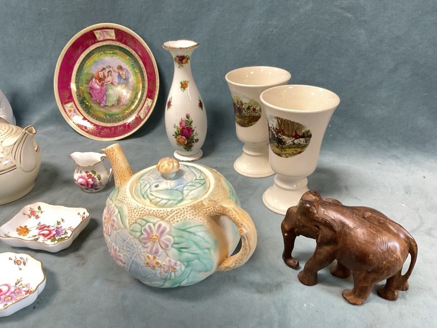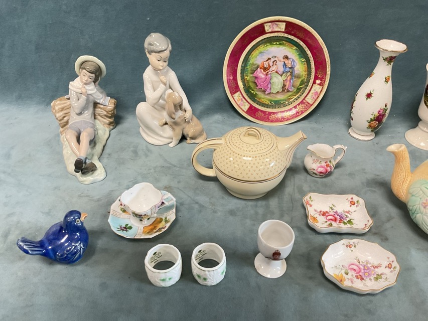 Miscellaneous ceramics - Lladro figurines, a Vienna style plate, an Avon Ware moulded teapot, a deco Woods Chandos teapot, Royal Albert Old Country Roses vase, pair of Palissy hunt goblets, Royal Crown Derby pin dishes, Coalport napkin rings, etc. (A lot)