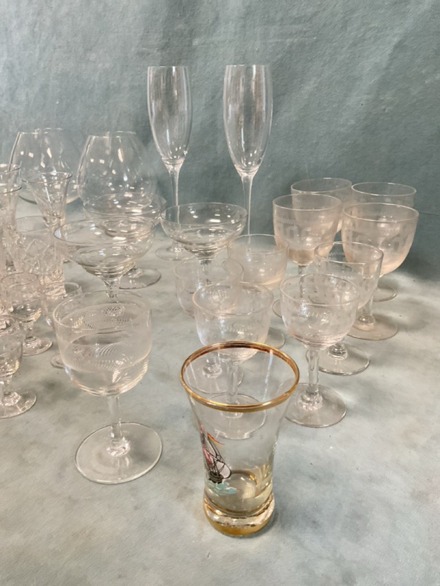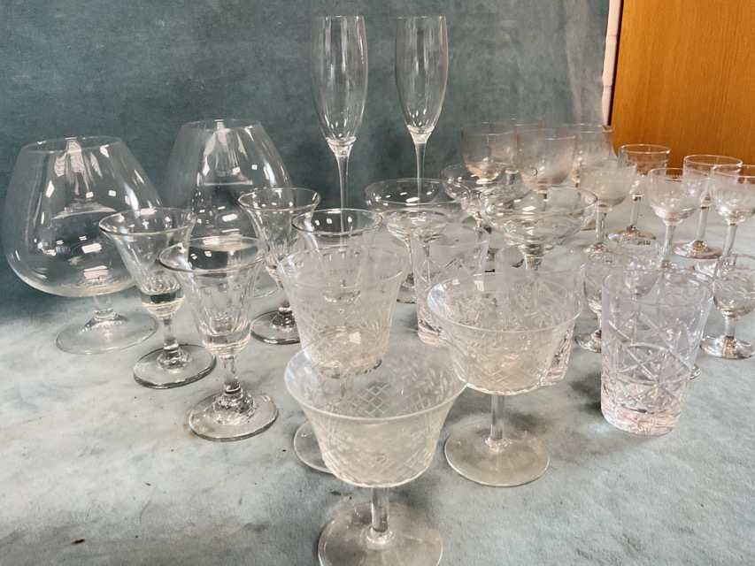 Miscellaneous Victorian, Edwardian and later drinking glasses, champagne flutes and coupes, sherry, liqueur, tumblers, brandy balloons, etc. (A lot)