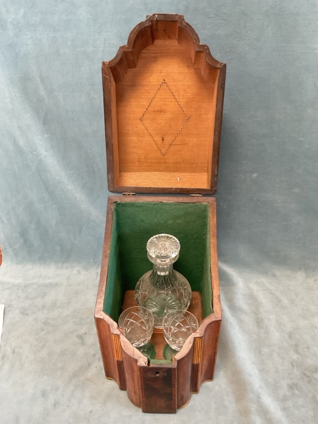 A Georgian boxwood & ebony strung and satinwood & rosewood crossbanded mahogany knife box with sloped cover, converted to a tantalus containing a cut glass decanter and a pair of glasses. (8.75in x 12in x 14.5in)