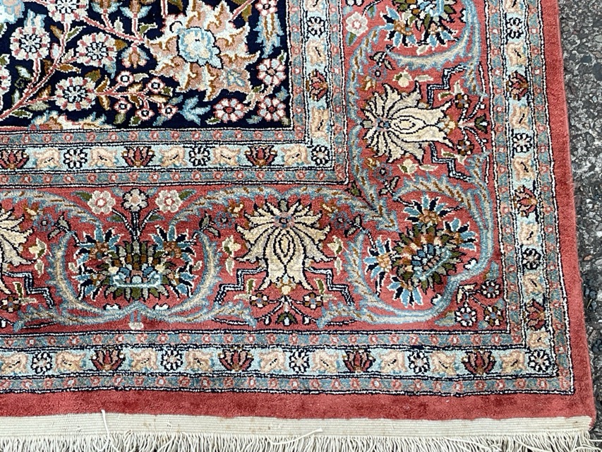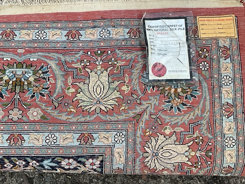 A fine Kashmiri silk carpet with pointed elliptical floral medallion amid dense foliage on a cream field, with floral spandrels within conforming scrolling and flowerhead borders. (109in x 72in)
