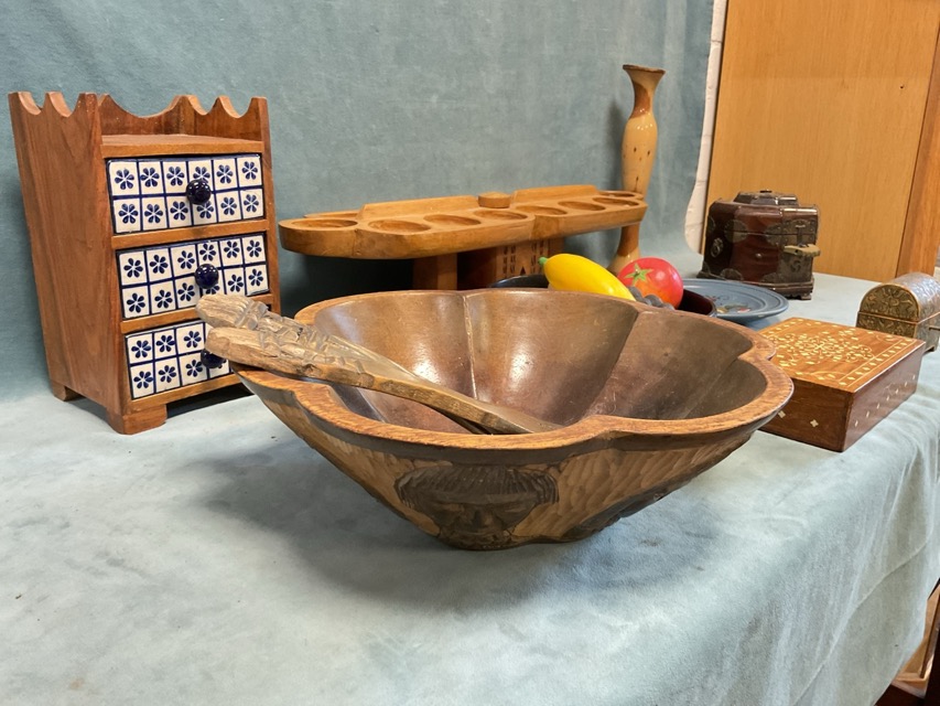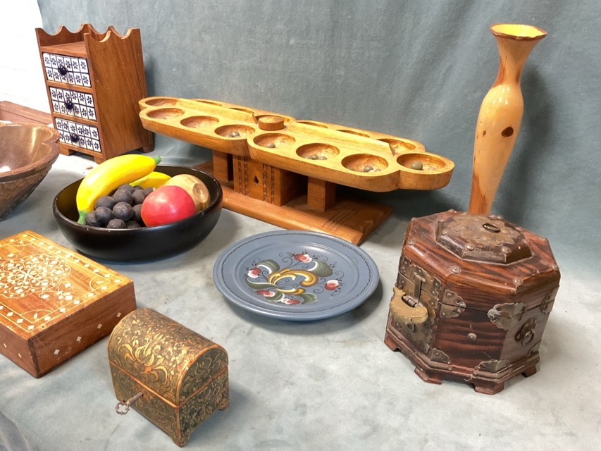 A hardwood ceramic drawers; an African Wari game board; a yew vase; an African bowl with servers; an ebonised bowl with carved fruit; a painted plate; a Chinese octagonal casket; a bone inlaid Indian box; and a miniature Italian renaissance style chest. (9)