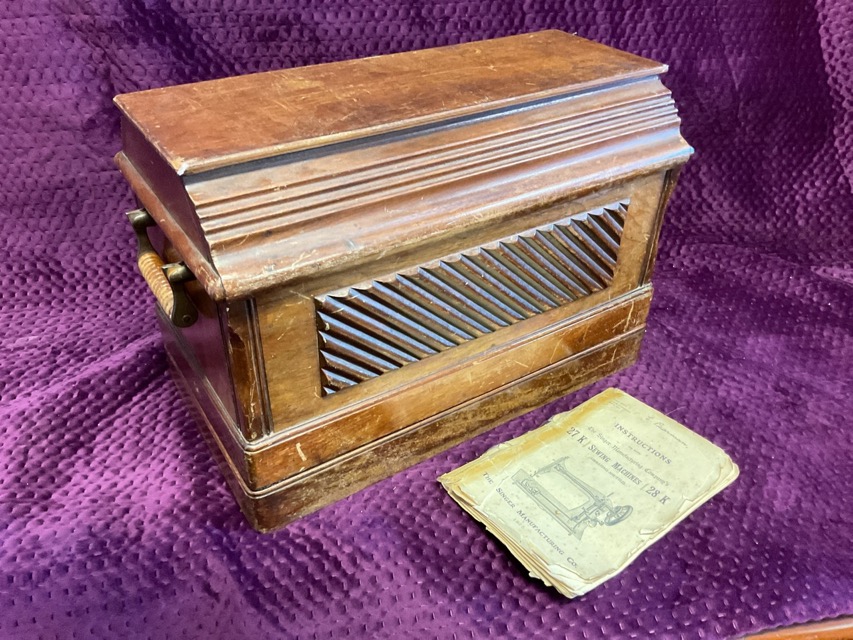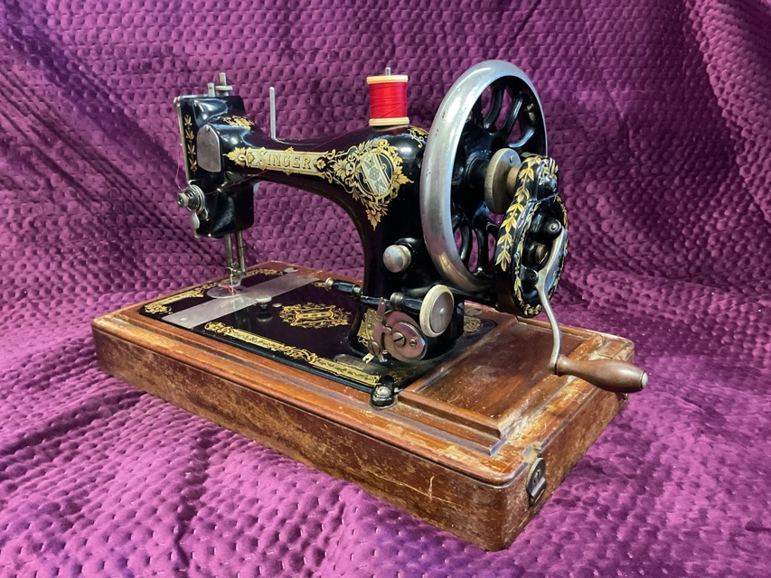A 1906 mahogany cased Singer model 28K cast iron hand-cranked tabletop sewing machine, with integral spool winder, black enamel finish and gilt foliate decoration, retaining its original instruction booklet.