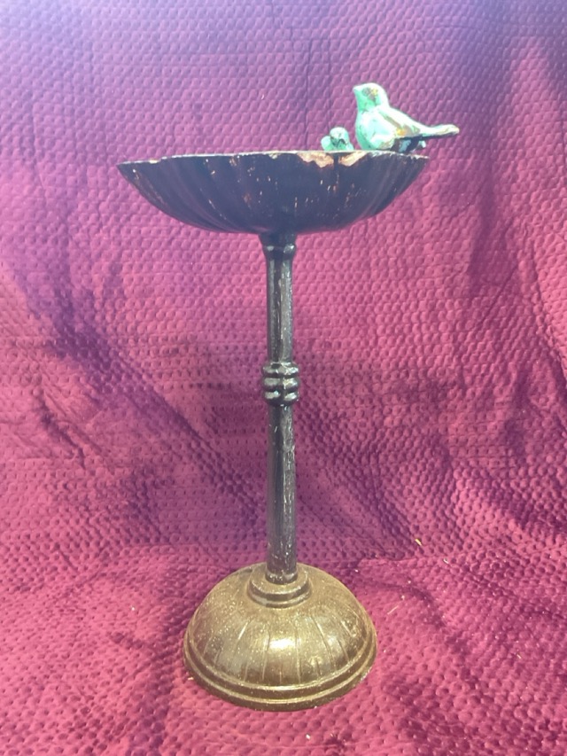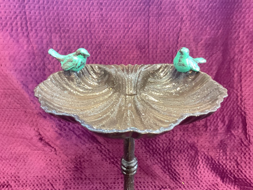 A cast iron birdbath with two birds perched on a shell form bowl, raised on a cylindrical knopped column with domed base. (22in)