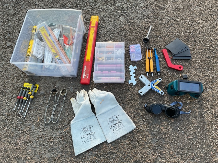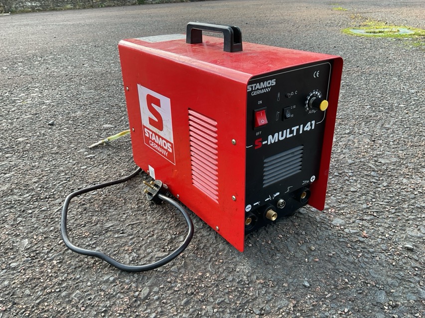 A German Stamos S-multi41 air cooled welder with tools, welding rods, gloves, masks, etc. (A lot)