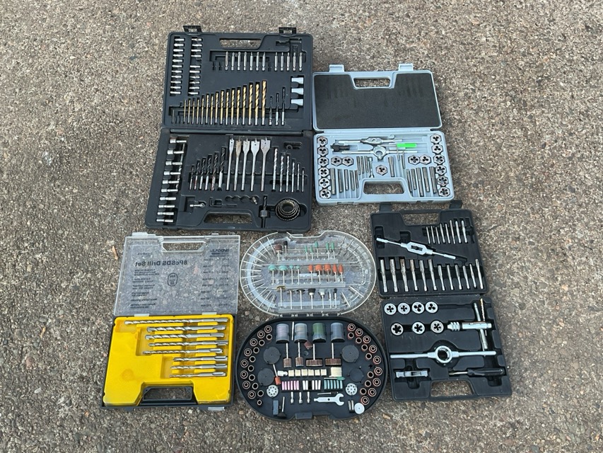 Miscellaneous cased materials & tools - tap & die sets, grinding & filing sets, drill bits, augers, drills pieces, etc. (7)