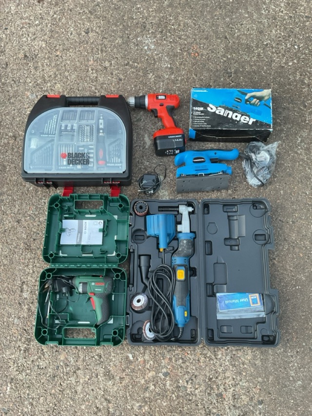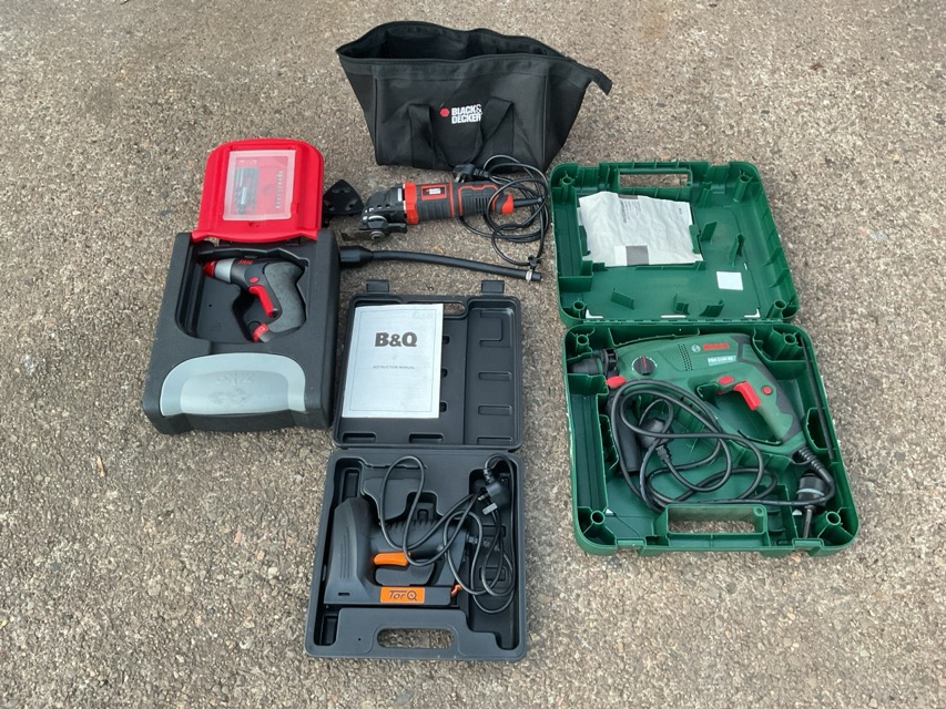 A cased Black & Decker drill & screwdriver set with bits; a boxed Bosch rotary hammer drill; a cased Skil cordless drill gun; a cased Torq electric stapler; a cased Workzone electric sander; a cased Bosch electric screwdriver; a bagged Black & Decker electric sander; and a boxed Powerbase orbital sander. (8)