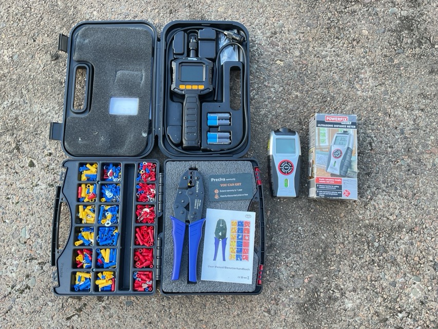 Miscellaneous tools & gear - a pair of magnetic wall trays, a cased inspection camera, wire brush wheels, a boxed hand crimping set, a boxed Powerfix ultrasonic distance meter, riveting pliers, a cased magnetic file set, etc. (A lot)