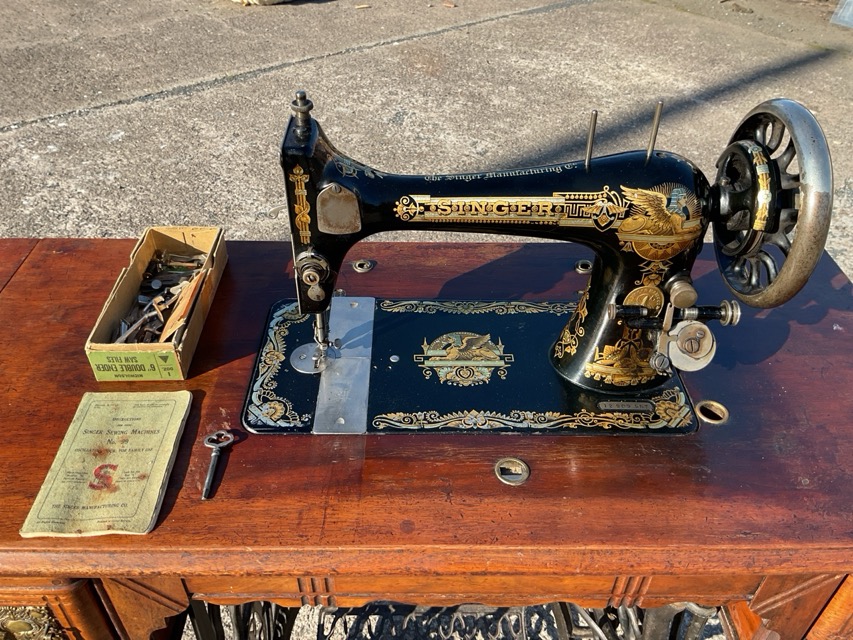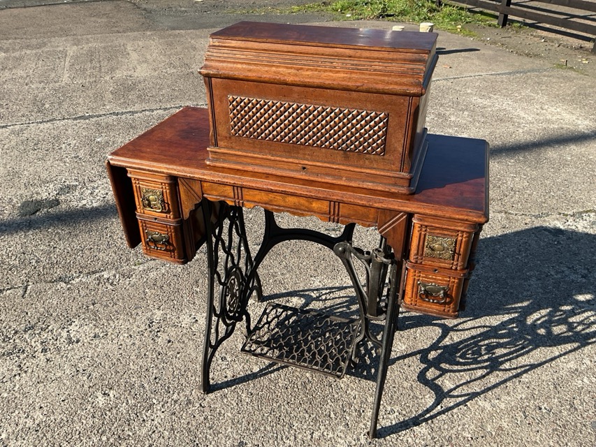 A mahogany cased Singer sewing machine - model 12909987- with cast iron treddle support and four small drawers, complete with instructions, attachments, key, etc. (44in x 42in x 40.75in)
