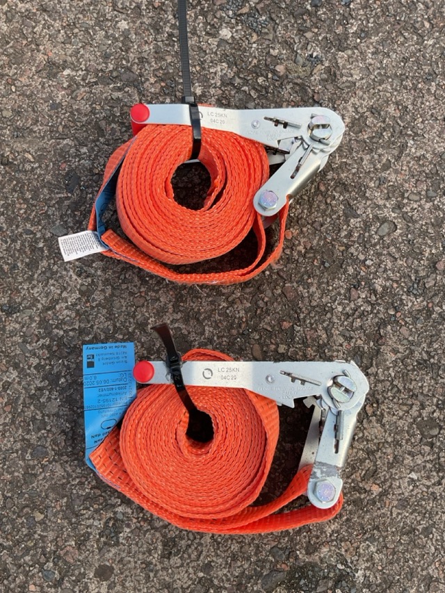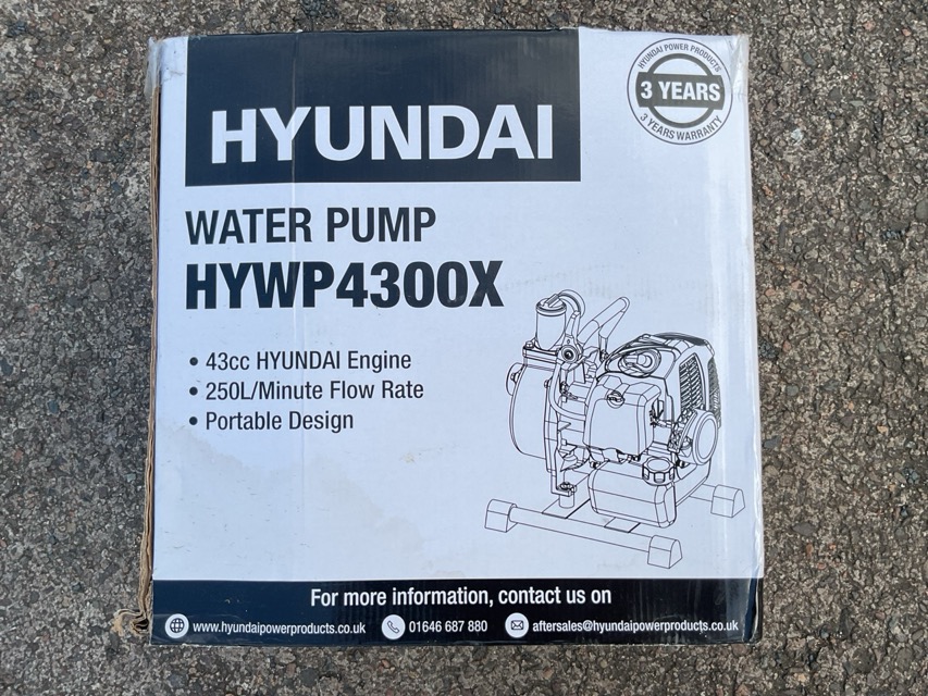 A portable Hyundai water pump - model HYWP 4300X- with attachments, hose, filter tools, etc; and two ratchet straps. (3)