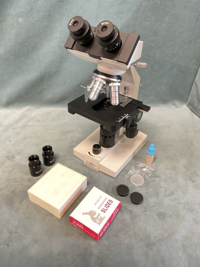 A cased unused Apex microscope with binocular view, lenses, adjustable table, slides, etc. (A lot)
