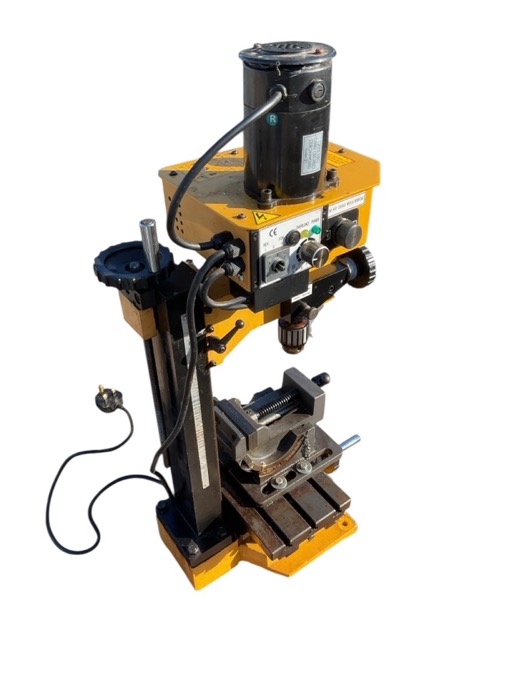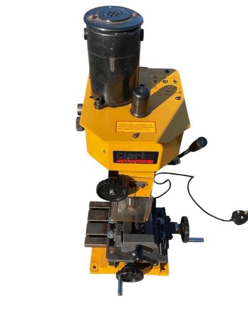 A Clarke Metalworker pillar drill with adjustable vice table, rev counter, cast iron stand, etc.