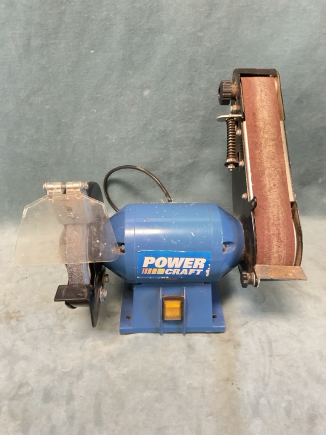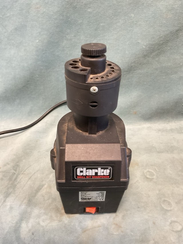 A Workzone bench grinder with two abrasive wheels; a Clarke electric drill bit sharpener; and a Powercraft bench grinder with abrasive wheel and sanding belt. (3)