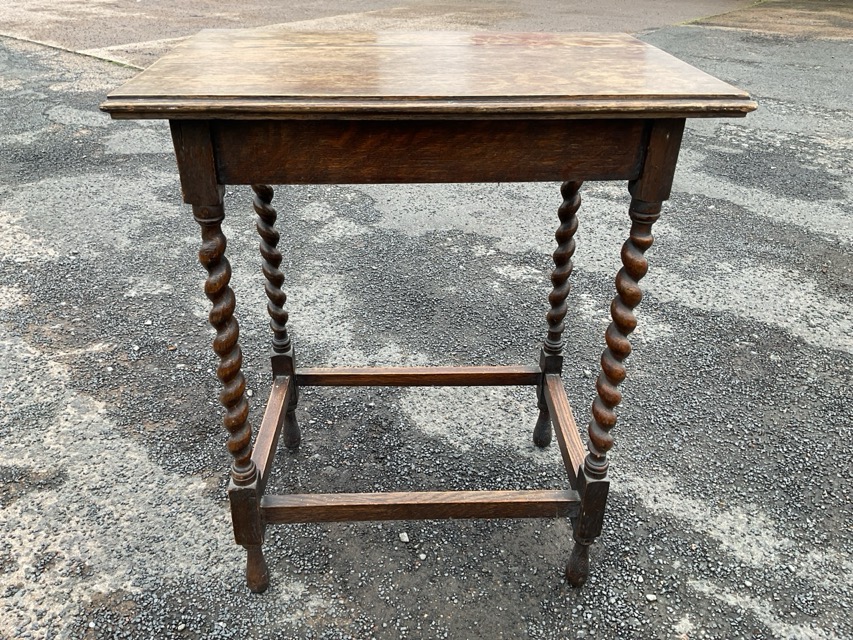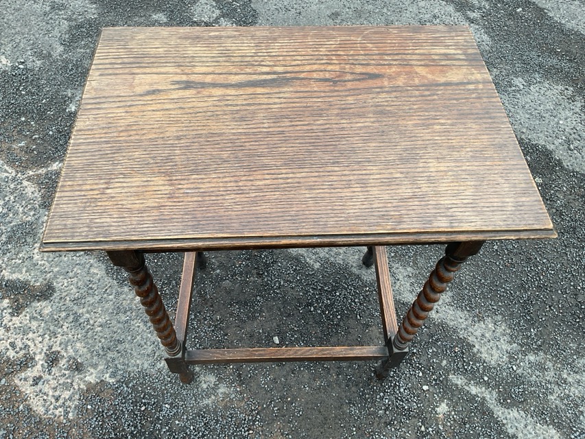 A rectangular oak side table with moulded top on barleytwist legs joined by square stretchers, having turned feet. (23.5in x 16.25in x 28.5in)