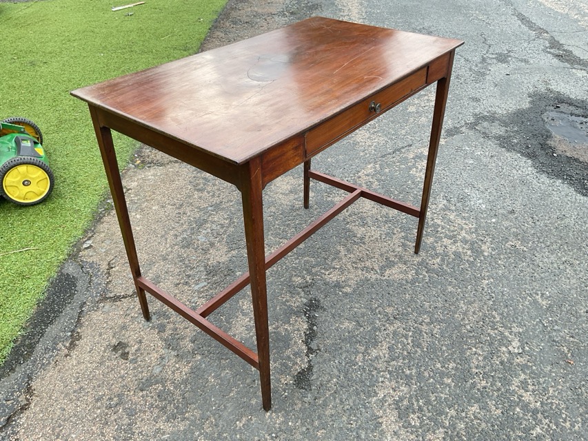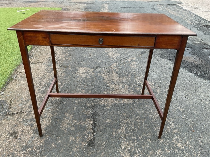 A Georgian mahogany side table with thin rectangular top above a compartmentalised fitted frieze drawer, raised on slender square tapering legs joined by rectangular stretchers. (35in x 20.25in x 28.75in)